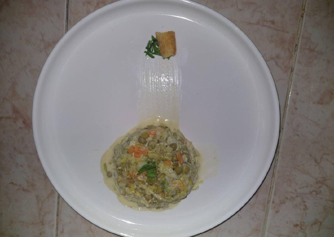 - Cortar los vegetales en brunoise y sofreír en mantequilla hasta que suden a temperatura baja.