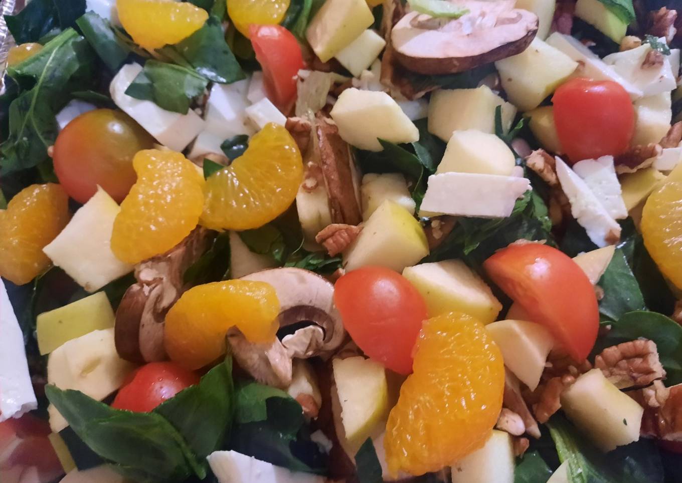 - Se desinfectan los ingredientes. Se cortan en porciones pequeñas. Se mezclan todos los ingredientes: espinacas, lechuga, tomate, manzanas, nuez, queso fresco, apio, champiñones y mandarinas, y listo.