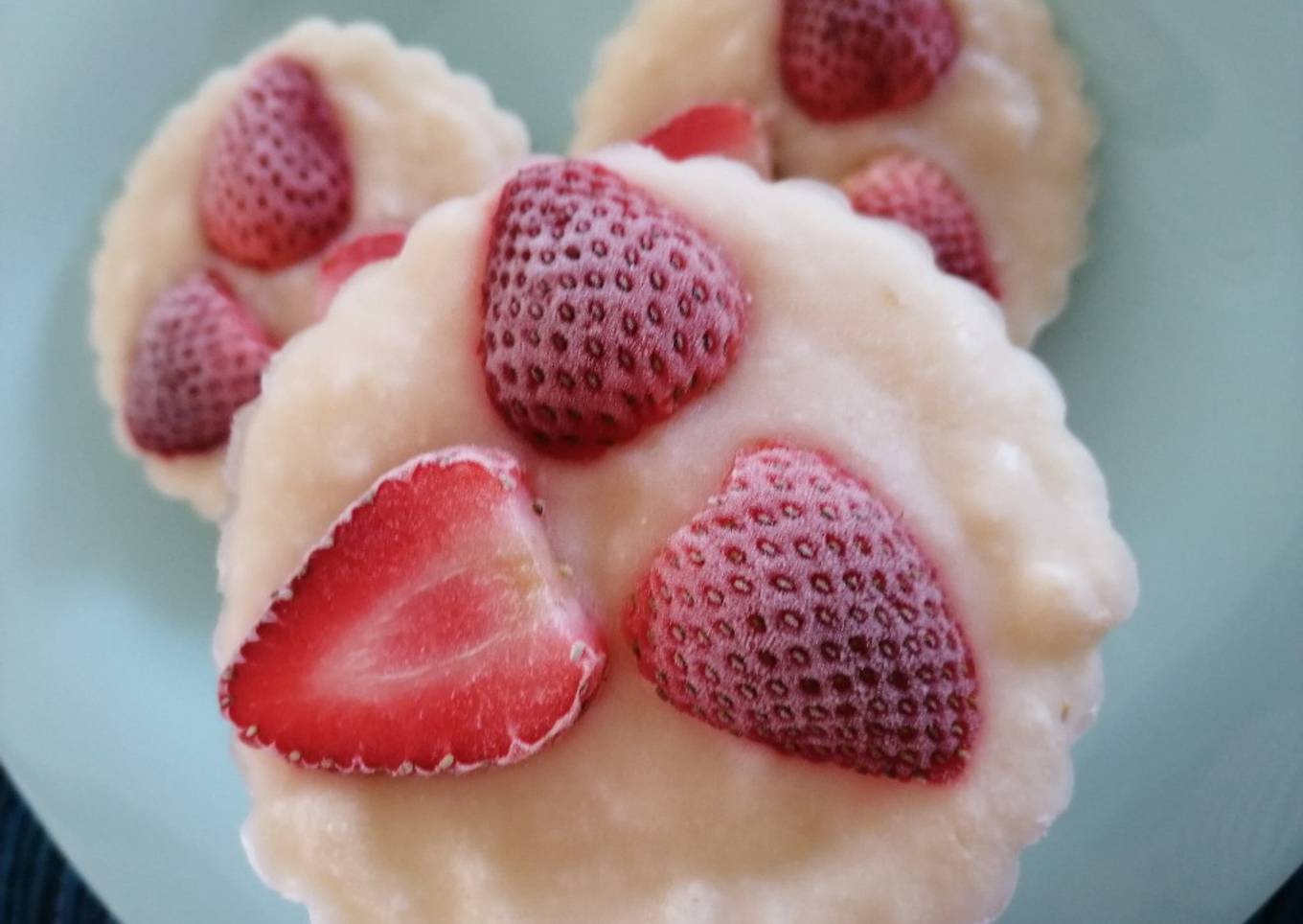 - Vaciar en moldes siliconados o charola con papel encerado, ponemos la cantidad suficiente para tener una altura de medio centímetro. Como me rindió para 4 porciones usé 4 fresas rebanadas. Pueden usarse más.