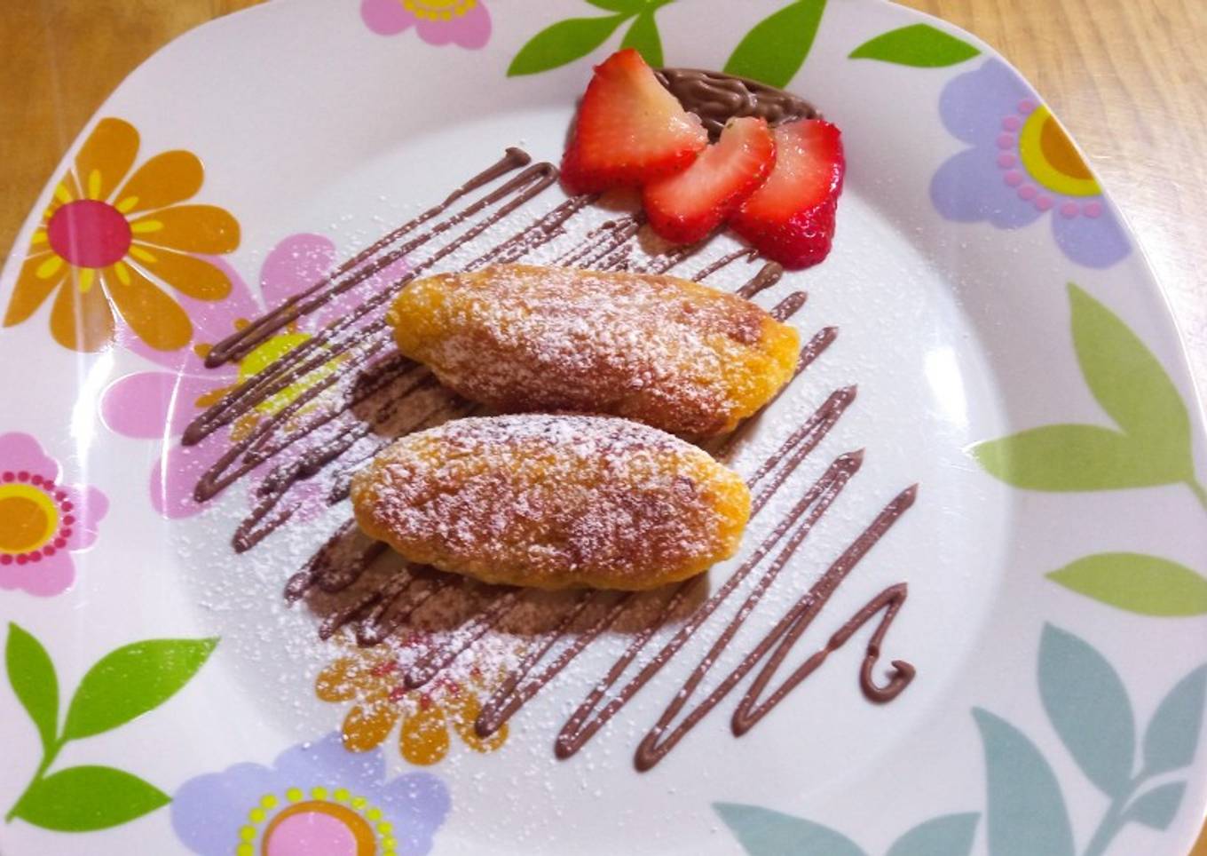 - Por último, decorar el plato con un zig zag de chocolate, acompañar con unas láminas de fresa, colocar los molotes y verter encima azúcar glass en forma de lluvia