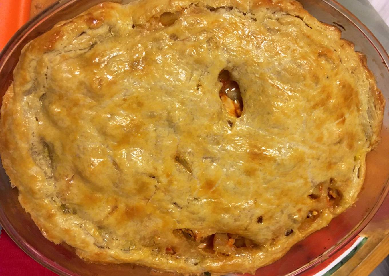 - Verter el relleno de pescado (cuidando de no poner líquido/caldo) y colocar la masa encima. Cortar los sobrantes y cerrar según prefieras : con tenedor, enrollando la orilla.