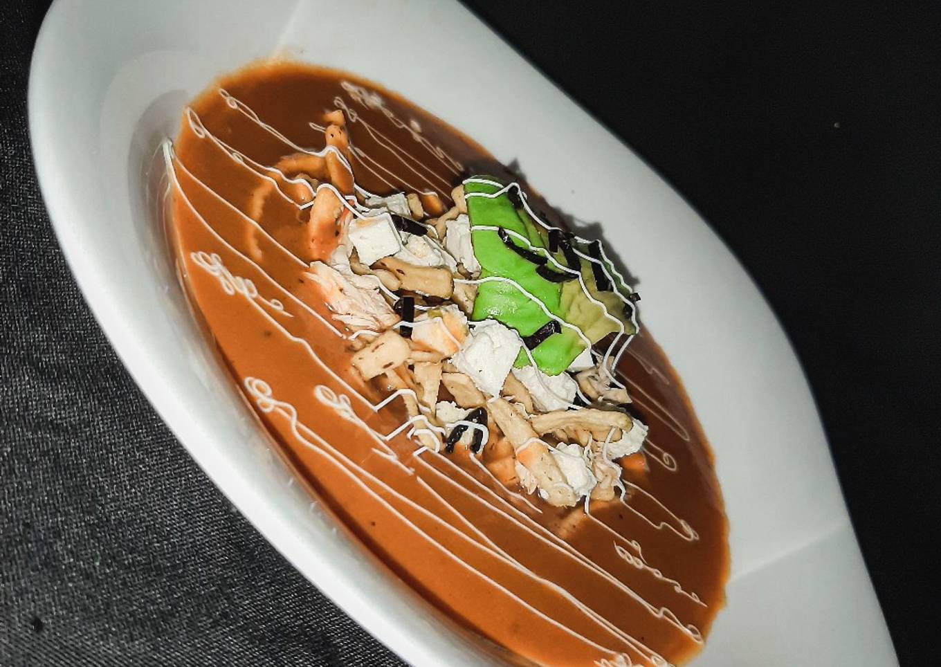 - Montamos con 25 g de tortillas, queso, aguacate y chile pasilla; añadimos el caldillo y agregamos un poco de crema.