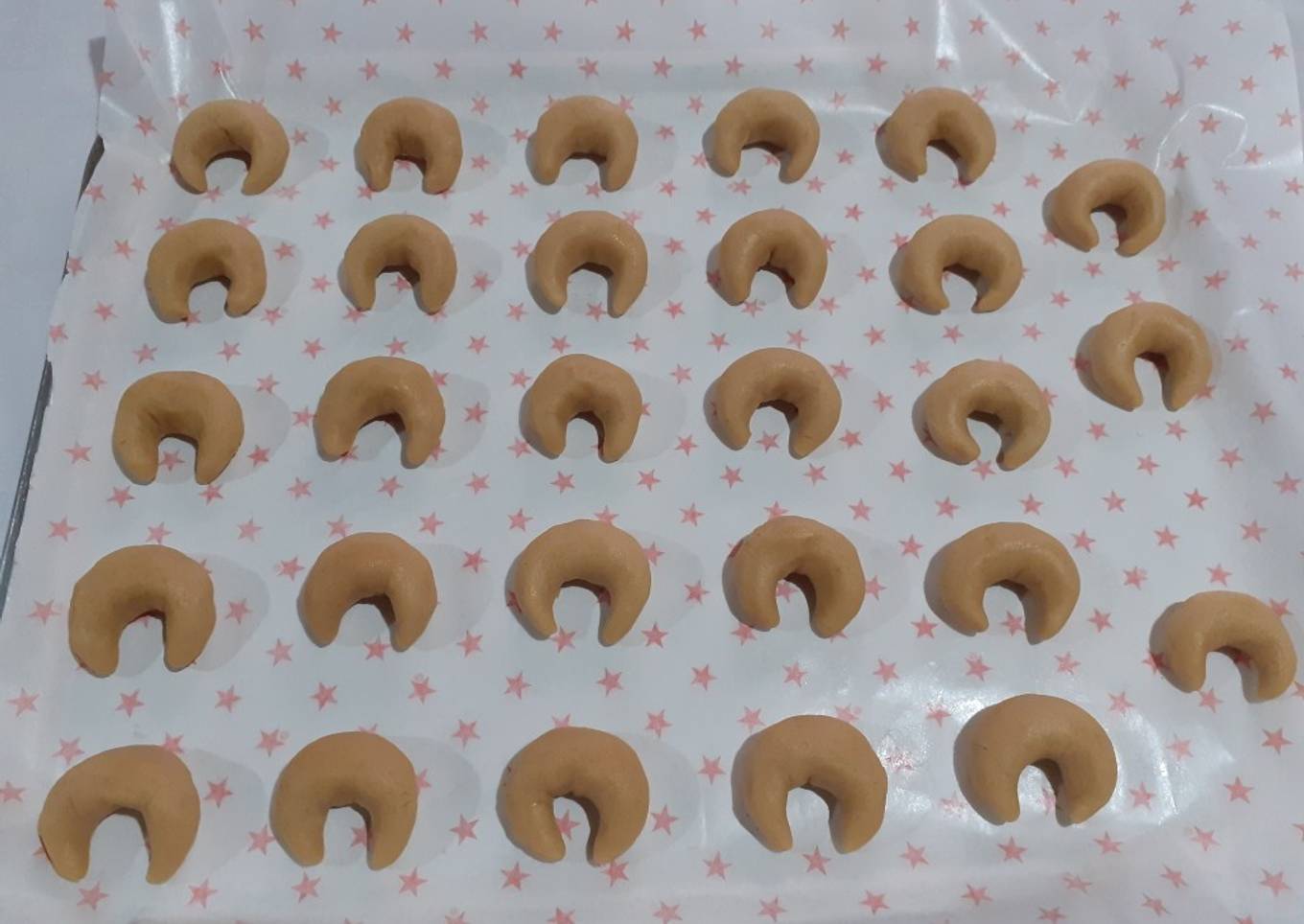 - Ya que formemos nuestros cuernitos los pasamos a una charola con papel estrella y horneamos a 180 grados por 30 minutos o hasta que tomen un color dorado y con eso lo sacamos del horno y dejamos enfriar y tendremos listo nuestros cuernitos.