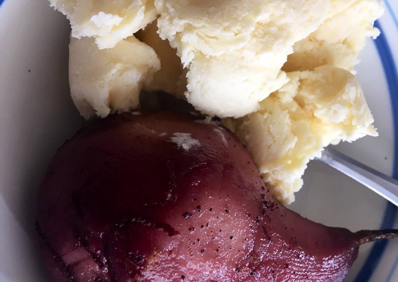 - Destapa, sirve cada pera en un plato hondo con un poco del líquido restante (colado) y una bola de nieve de vainilla.