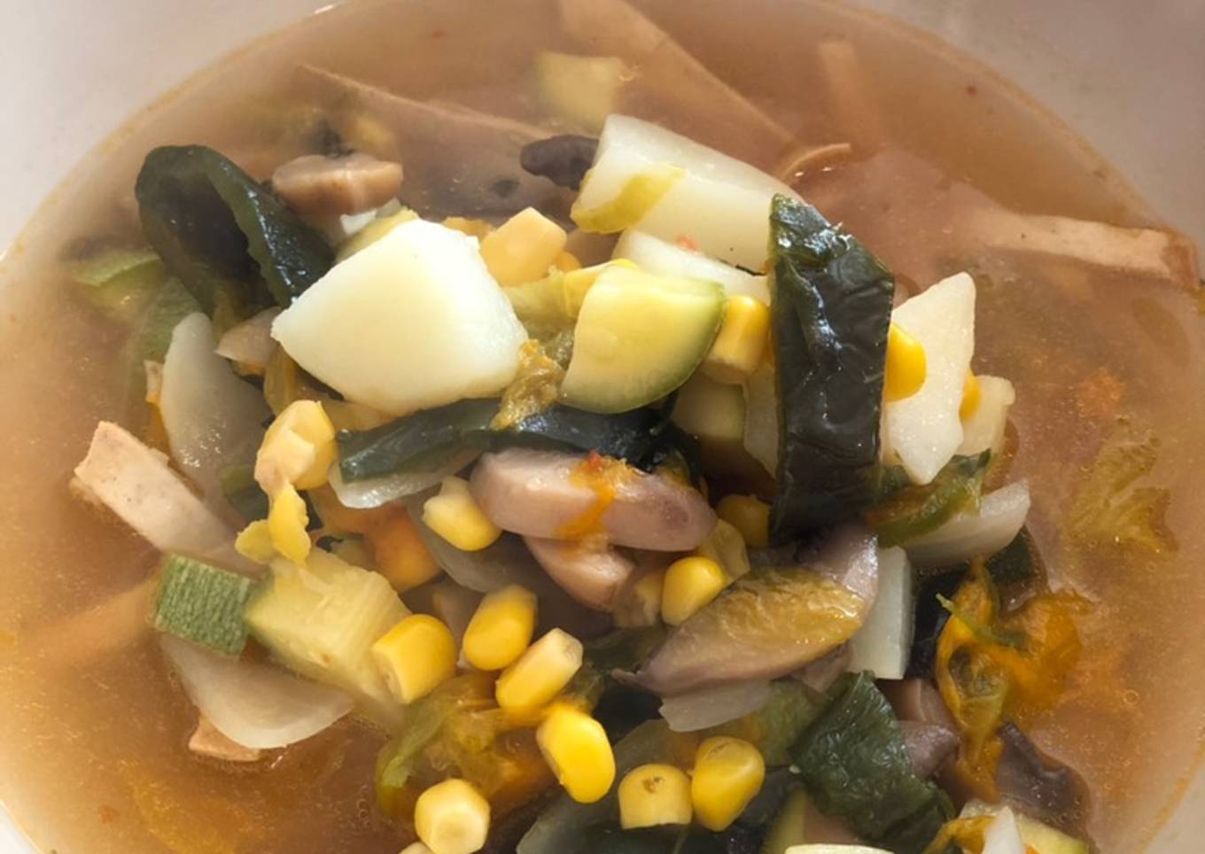 - Agregamos el elote y los champiñones, yo usé de lata porque en mi ciudad no es temporada, pero sí consigues naturales tienes que agregarlos antes del caldo.