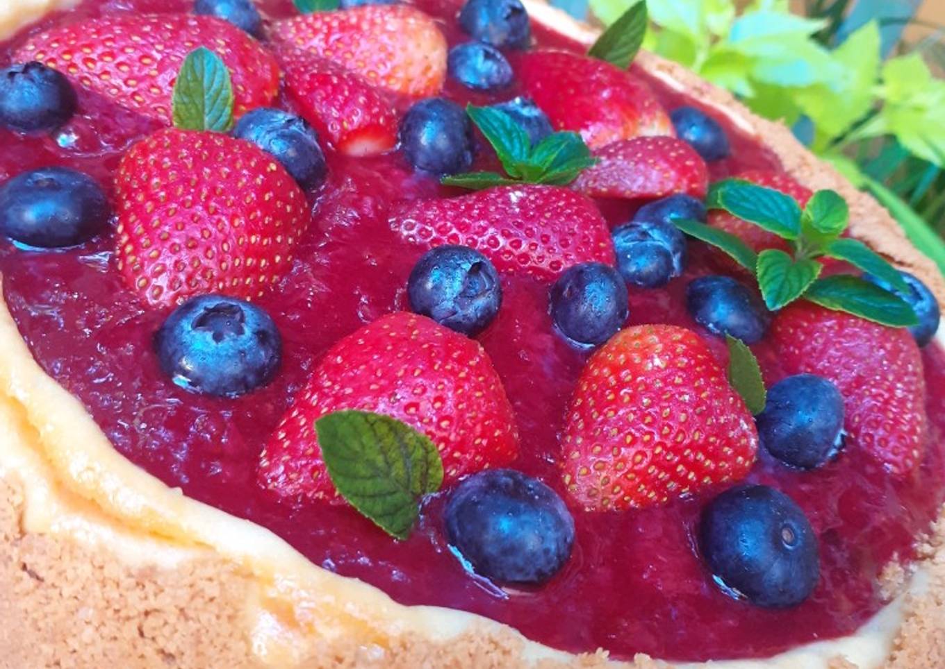 - Ya que el cheesecake este frío y la compota también, comenzaremos a poner la compota por encima y esparcimos muy bien, terminaremos la decoración con unas fresas, moras azules y hojas de menta y listo a disfrutar