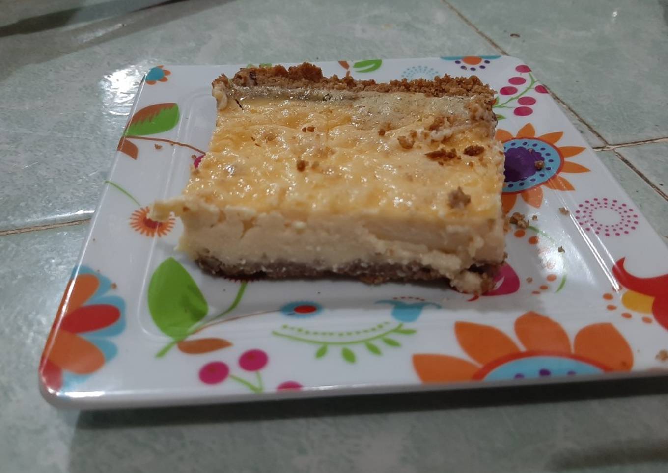 - Se vierte la mezcla sobre la base de galleta, utilizar una pala de cocina para evitar que la caída de la mezcla quiebre la base.