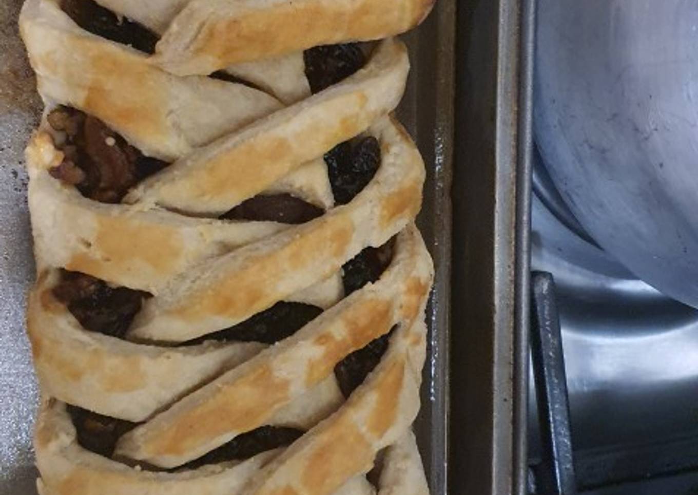- Poner la mezcla fría ya echa previamente en medio de la pasta de hojaldre y cerrar primero las dos partes más grande de arriba y abajo de ahí poner una tira de cada lado entre crusandolas